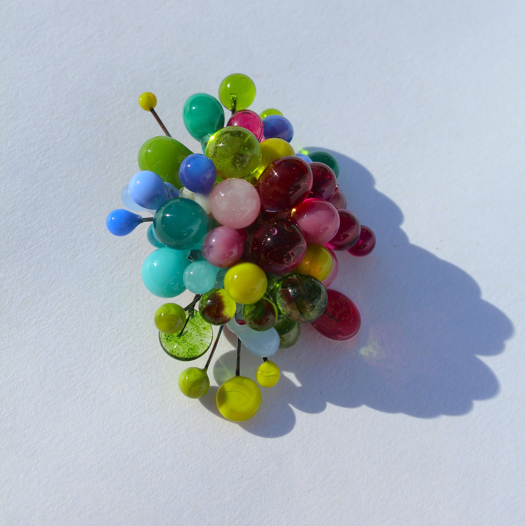 I sculpt glass with torches to make these beads by hand, and they're composed into a brooch with small glass drops on a structure with steel, nichrome, and textiles.