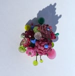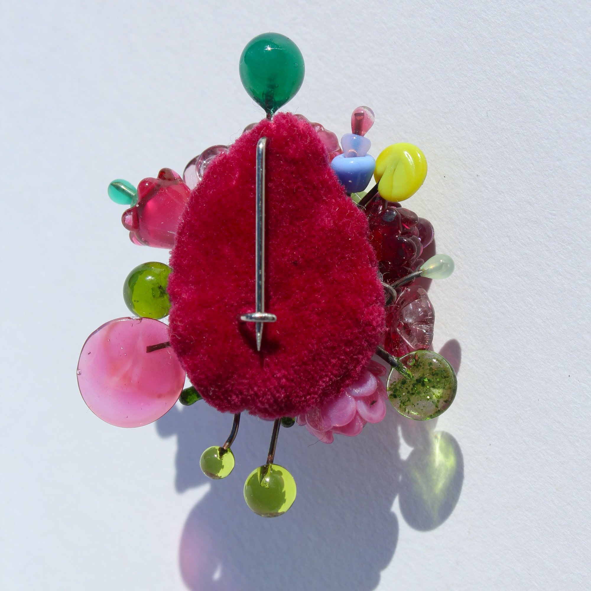 This brooch is made of lampworked glass, steel, nichrome, and textiles. The whole piece measures just under 2 inches/ just under 5 centimeters long.